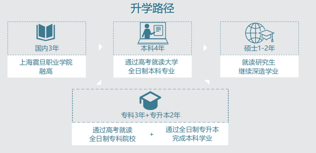 学生完成学业后,可根据自身学业水平选择国内高考、国内合作办学及海外升学等多种途径完成本科学业,更多选择更多通道,升学无忧。